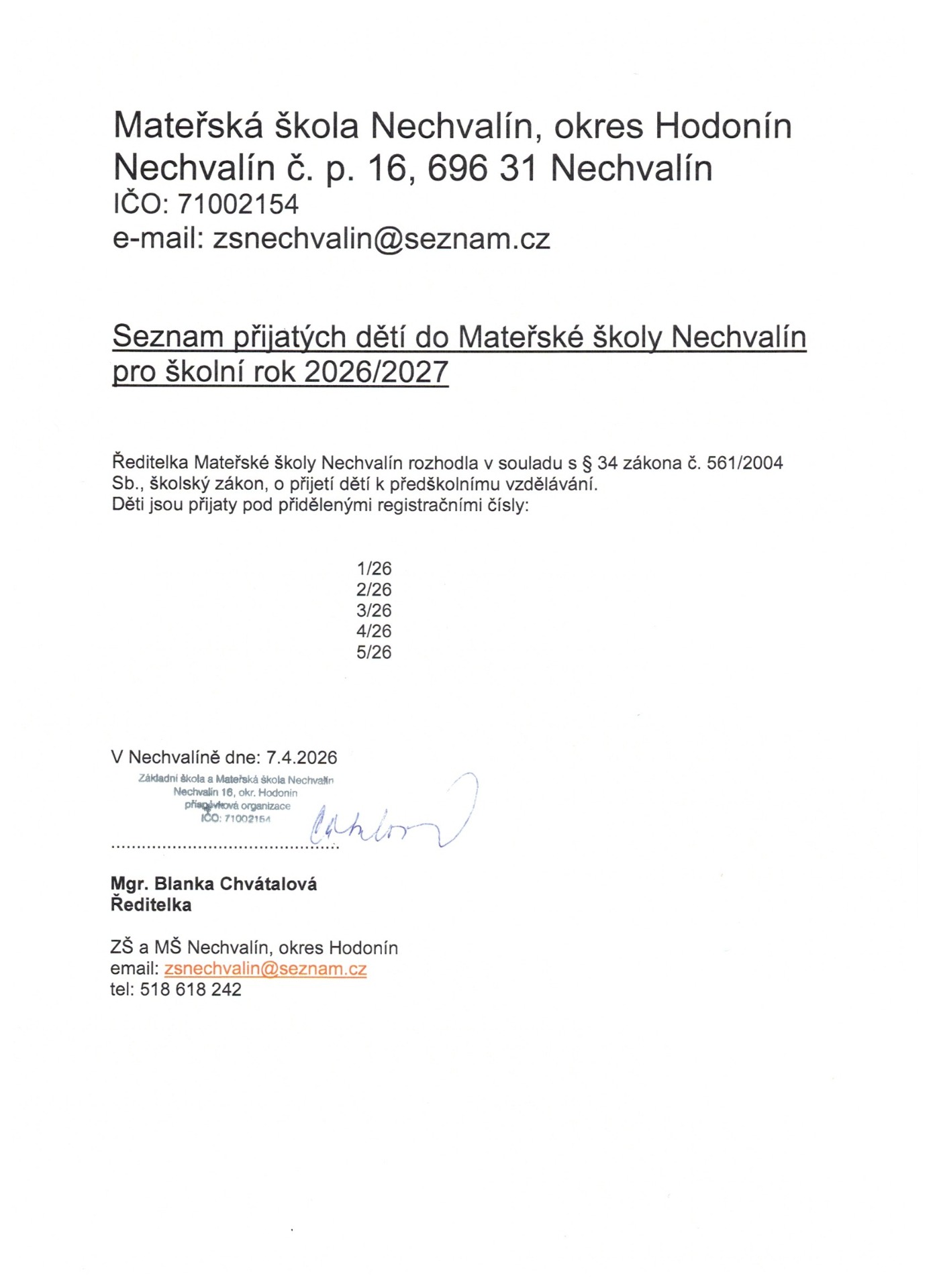 Seznam žáků přijatých do MŠ